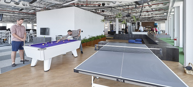 Further internal spaces include a beer garden and a classroom, which both feature semi-private screening that offers a visual buffer and acoustic rafts which enable both spaces to become a feature within the open-plan environment. Foam blocks can be used to create bespoke room sizes, or used as additional seating if necessary. The main work areas have also been designed with employee wellbeing in mind, complete with sit-stand workspaces, and a layout which facilitates the creation of individual working neighbourhoods within the open-plan space, connected by supporting spaces.