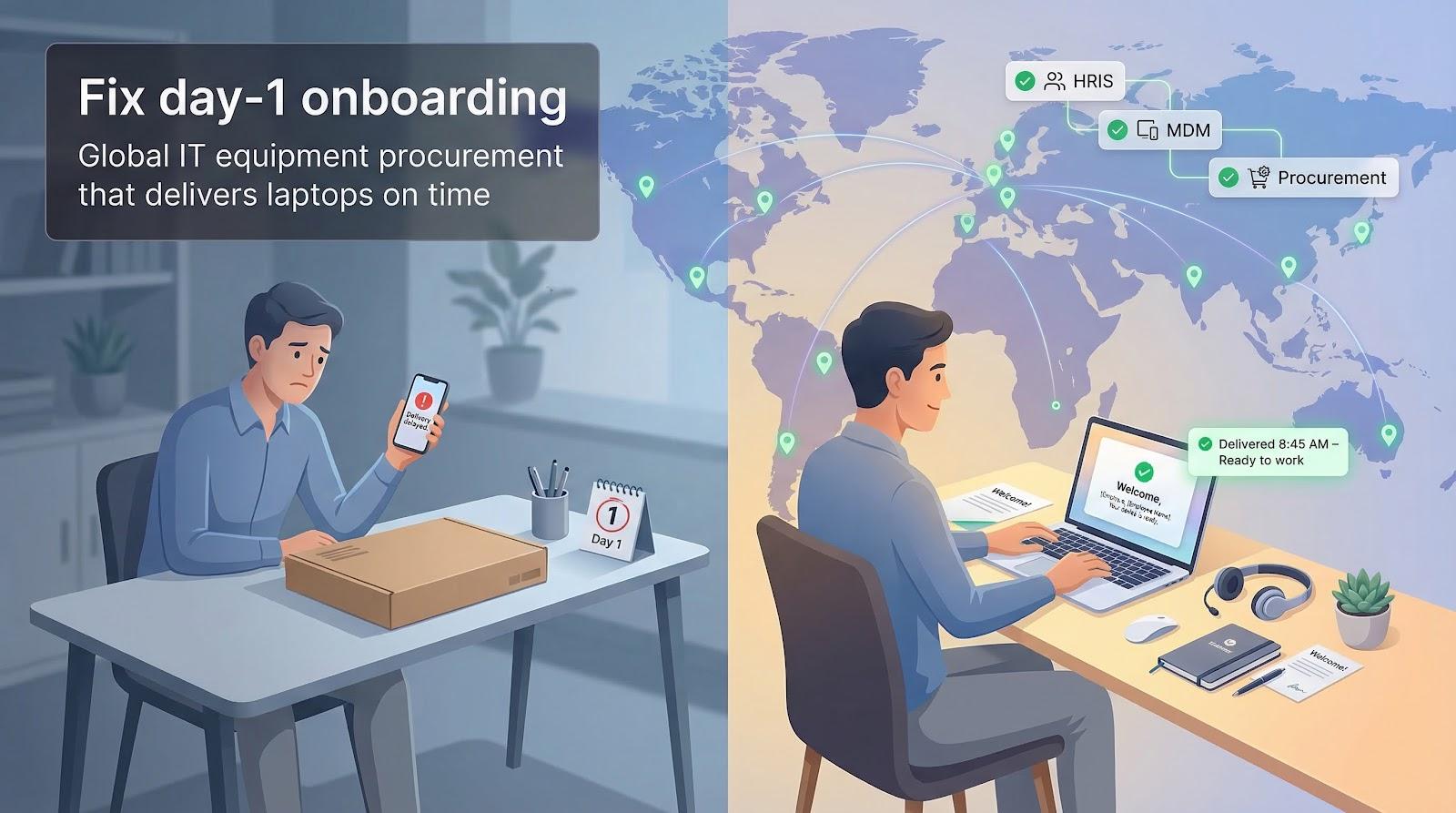 Your new hire signs in on their first morning—but their laptop is still in transit. They can’t code, join calls, or impress anyone.
