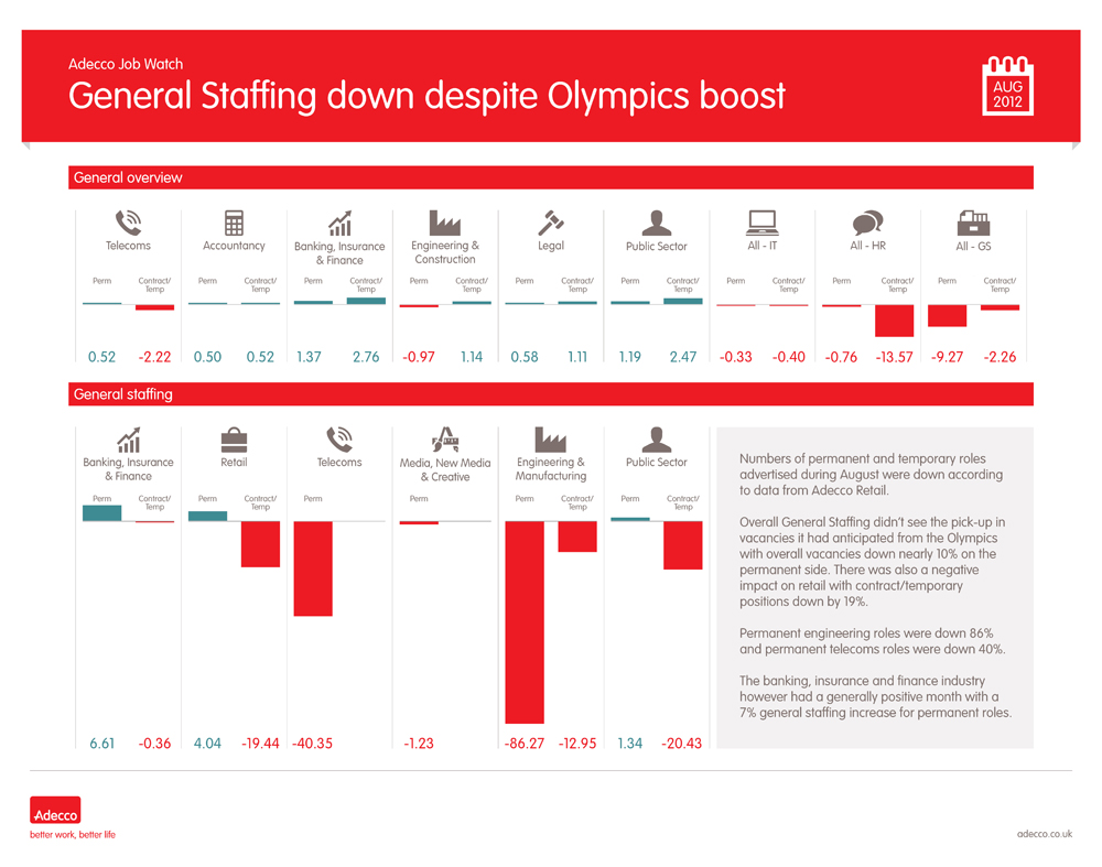 Overall General Staffing didn’t see the pick-up in vacancies it had anticipated from the Olympics with overall vacancies down nearly 10% on the permanent side. There was also a negative impact on retail with contract/temporary positions down by 19%.