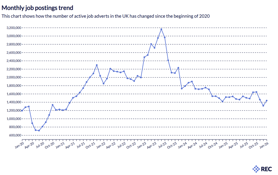 The more than 1.4m active job postings in January 2026 was up on the previous month, according to the latest Recruitment & Employment Confederation (REC) and Lightcast Labour Market Tracker.