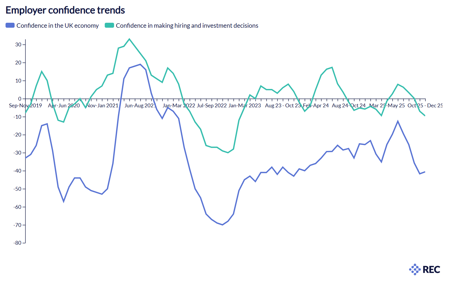 Surveyed employers’ confidence in the UK economy weakened further between October and December 2025. Perceptions of economic conditions fell by five percentage points from the previous quarter to net: -41%, driven by particularly low sentiment in October. Confidence did improve a little after the Chancellor’s Autumn Budget in November and December.