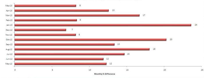 The average salary for those securing new jobs in May 13 once again increased with an 8% rise. This compares to an increase of 12% in both April 13 and May 12.