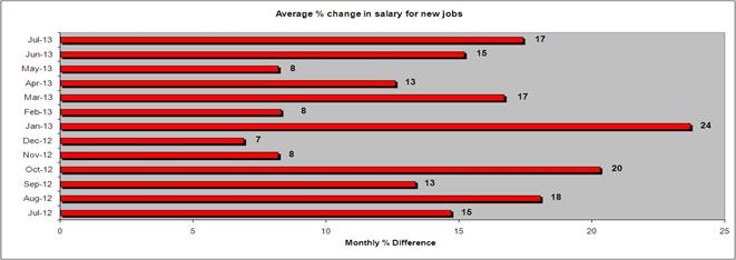 The average salary for those securing new jobs in July 13 rose again by 17% compared to a 15% increase the previous month.