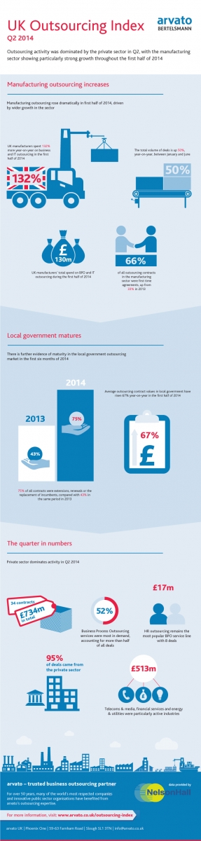 The arvato UK Quarterly Outsourcing Index was compiled by leading BPO and IT outsourcing research and analysis firm NelsonHall, in partnership with arvato. The research is based on an analysis of contracts completed in the first half of 2014.