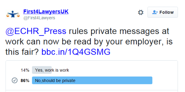 First4lawyers conducted a quick poll, asking the people of Twitter whether they agree with the law and think it is fair or whether it is unjust. A large 86% of respondents said that the new ruling was unfair and that private messages should remain private! However, 14% disagreed arguing that at work your time is your employer’s. Do you agree?