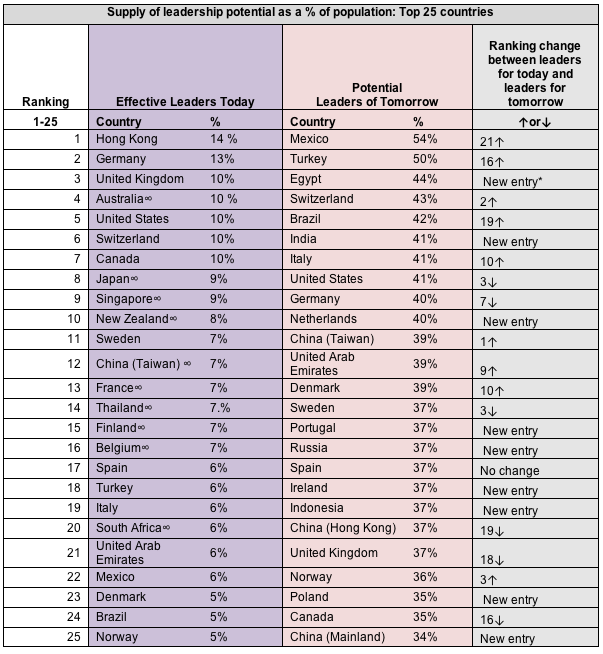*New entry – those countries not ranked in the top 25 leaders today but listed in the top 25 for leadership potential tomorrow