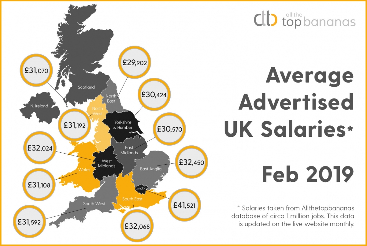 Comparing February ’19 with January ’19 on www.allthetopbananas.com London is the only area to decrease, but continues unsurprisingly to offer the highest in the UK with an advertised average of £41,521.