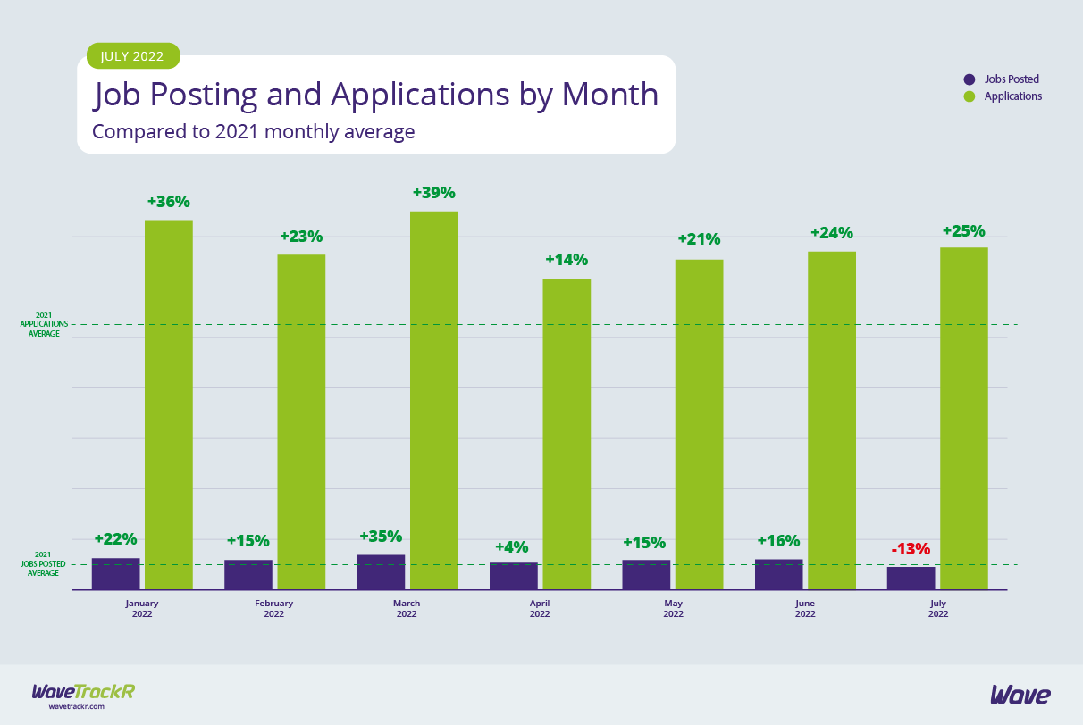 What is positive is that application numbers are holding. The WaveTrackR report registered a 1% increase both over June’s application figures and the 2021 monthly average. This difference in job and application activity has resulted in a higher average number of applications per job, rising by 4 from June to 15. This will at least be welcome news to recruiters who, over the past 18 months, have struggled to attract candidates from a diminishing pool to soaring numbers of jobs. Of course, alongside caution brought about by the war and rising costs, this may be partly the reason for the falling number of jobs - with skills shortages at an all-time high, employers have been re-thinking their plans for growth.