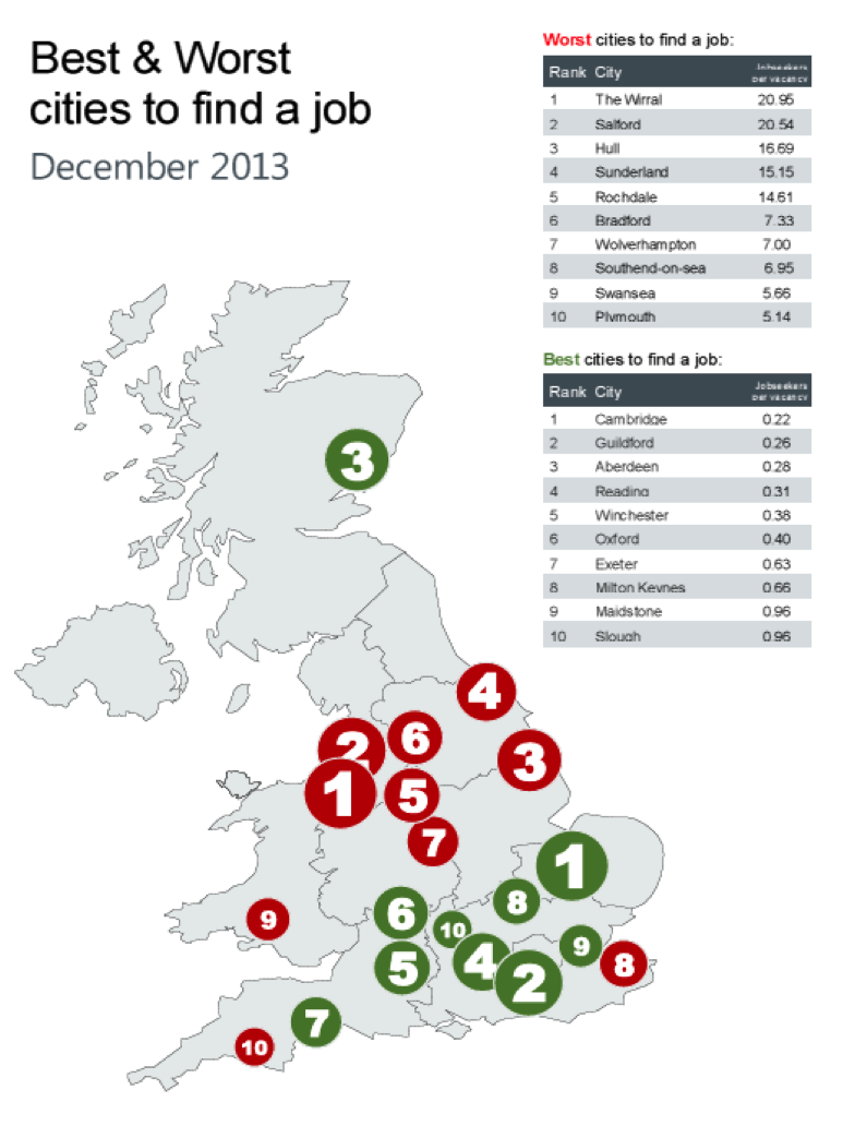 There are, however, a few signs that the situation is improving for some industrial pockets in the North. Wolverhampton may be the seventh worst city in the UK to find a job, but competition for vacancies in the city is falling rapidly, and has dropped 38% over the last six months, bolstered by a strong service sector, and growing manufacturing and engineering industries.