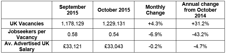 October saw 1,229,131 total advertised vacancies compared to 664,130 jobseekers – meaning there are now two vacancies to every jobseeker within the UK. This has led the ratio of jobseekers to vacancies to a new post-recession low of 0.54, down 43.2% from October 2014 when this figure stood at 0.95 – or one vacancy per jobseeker – as climbing vacancies offer more options to jobseekers.