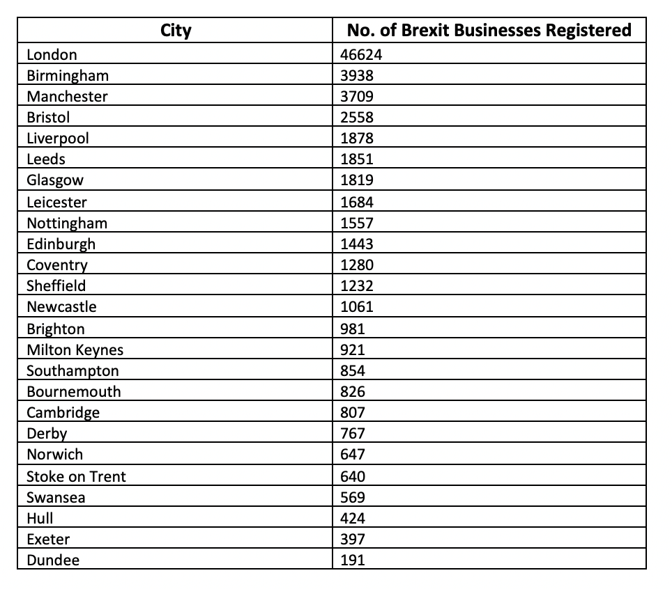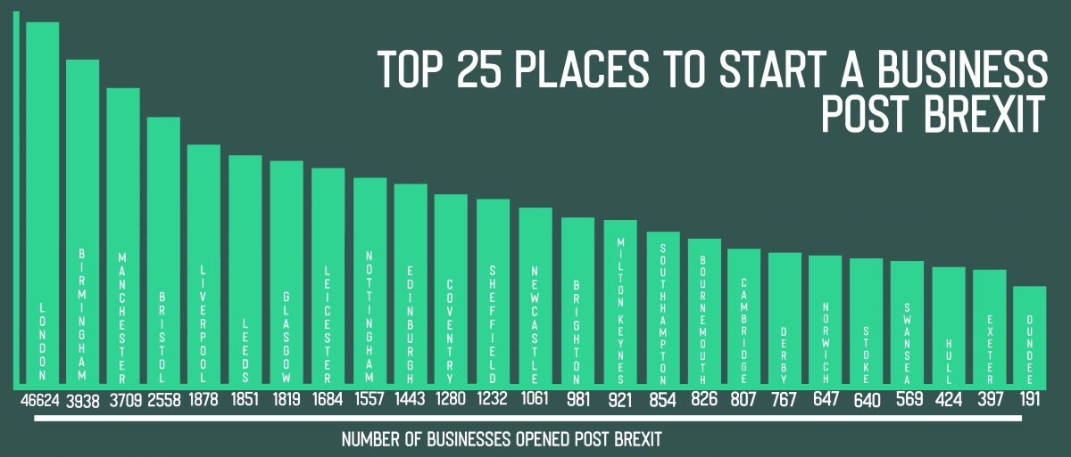Where in the UK is the best place to start a Brexit business according to companies house data? This would be the capital, as the home to some of the UK's largest businesses it's no surprise startups flock to the big smoke with 46,624 businesses setting up here since the referendum was announced.