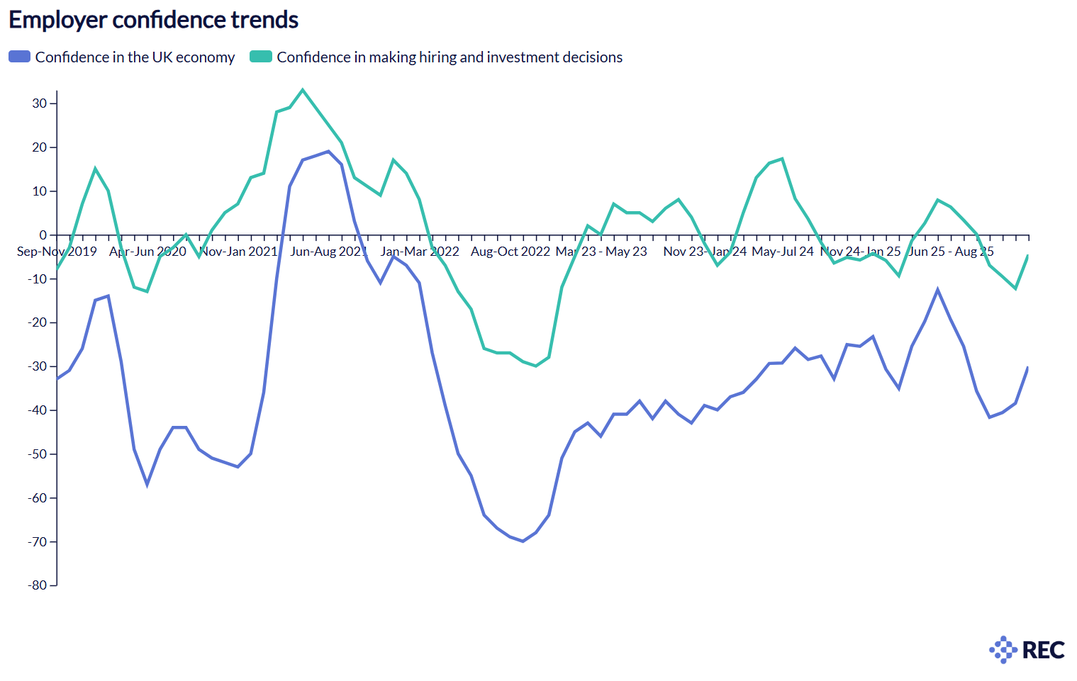 Employer perceptions of how the UK economy was performing improved by 11 percentage points between December 2025 and February 2026 to a net: -30%. While still historically weak, the trend was driven by significant bounce-back in February to net: -16% for the month.