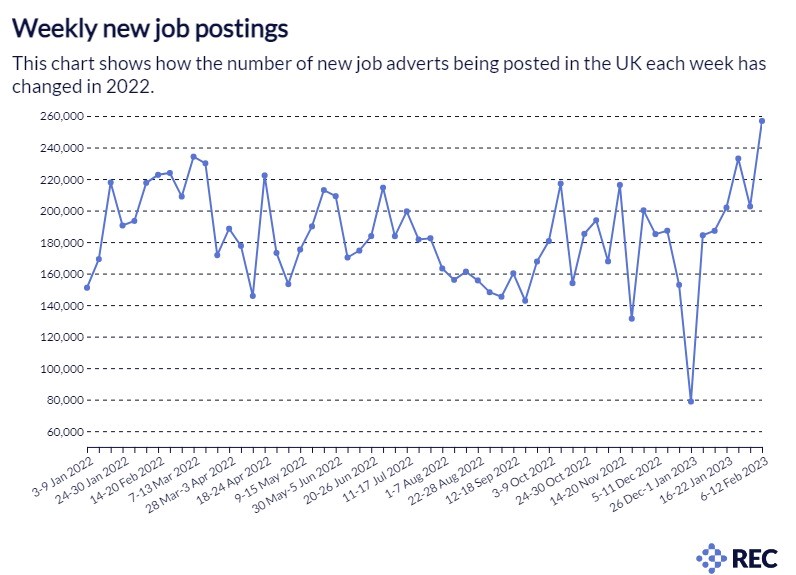 There was a boom in the number of new job adverts (256,855) in the week of 6-12 Feb 2023, according to the Recruitment & Employment Confederation (REC) and Lightcast’s latest Labour Market Tracker.