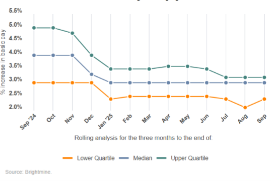 - Organisations are forecasting a median 3% pay award over the next 12 months. This is identical to the median pay awards recorded by Brightmine for the 12 months to the end of August 2025.