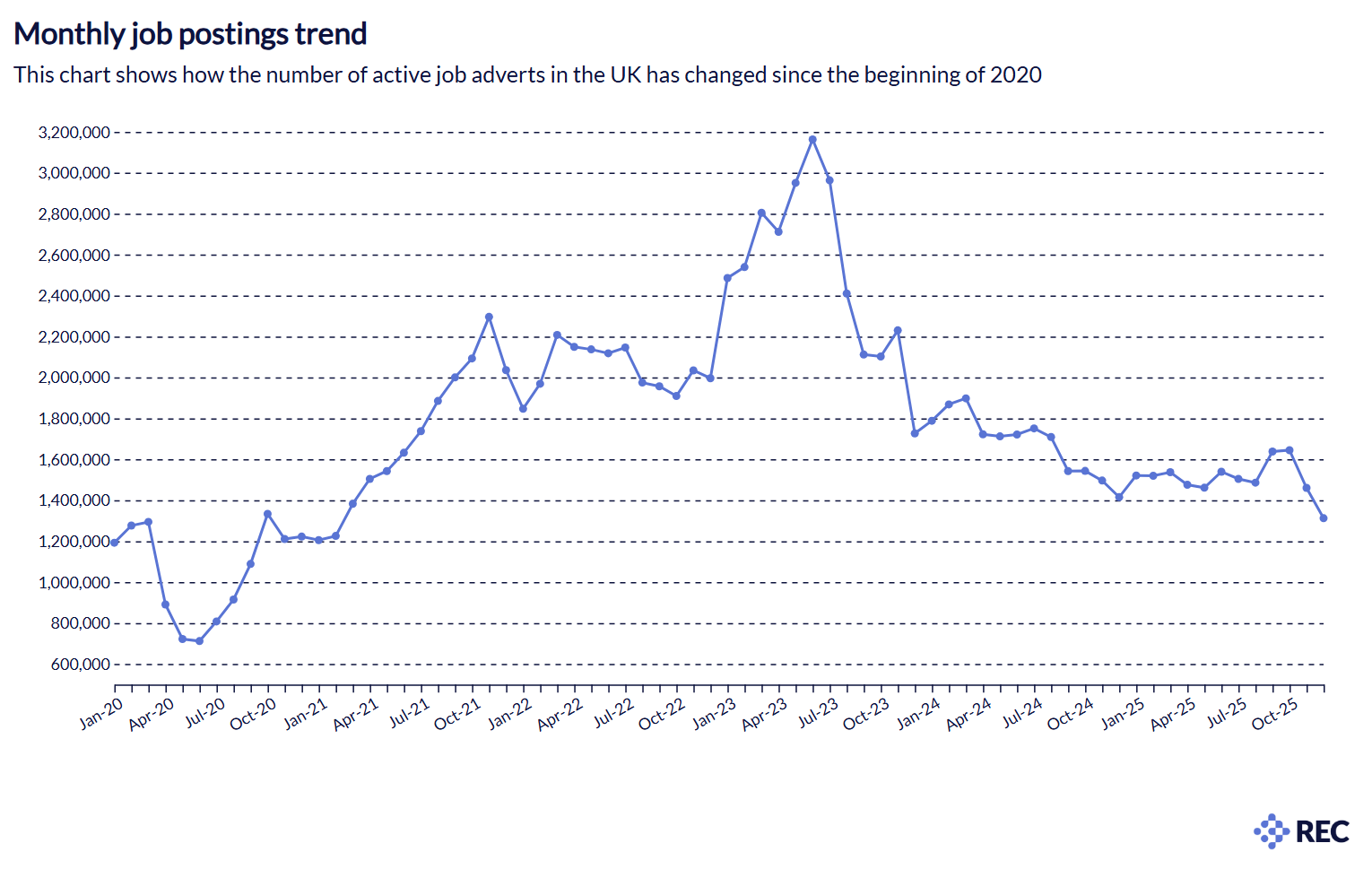 - The total number of active job postings in December 2025 stood at 1,311,956, representing an 11.1% decrease from November 2025. Such falls are typical in the run-up to Christmas.